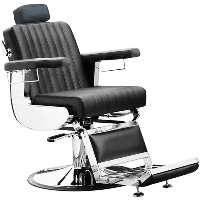 Der Stuhl kann in Liegeposition gebracht werden. Die Rückenlehne ist aus hochwertigem Kunststoff und extra dickem Schaumstoff. An der Seite des Stuhls sind stabile Handtuchhalter montiert. Die verstellbare Kopfstütze kann je nach Bedarf nach oben oder unten geschoben werden. Durch den runden Chrom-Fuß mit hydraulischer Pumpe kann die Sitzhöhe ganz einfach verstellt werden. Die komplette Fußstütze ist mit Chrom ummantelt und kann nach oben geschwenkt werden. Aufgrund der Rillen wird ein Rutschen der Füße verhindert.