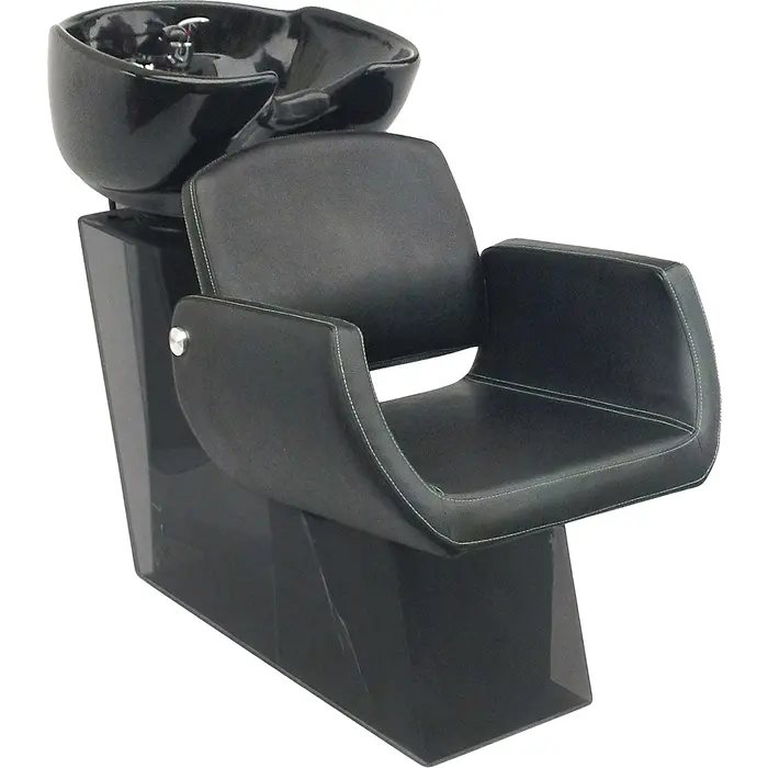 bequemer und stylischer Waschplatz mit beweglicher Rückenlehne, italienischer Profi-Armatur, Korpus aus stabilem und pflegeleichtem Kunststoff. Das Porzellan- becken ist in der Neigung verstellbar. Höhe bei ge- kipptem Becken 97 cm.